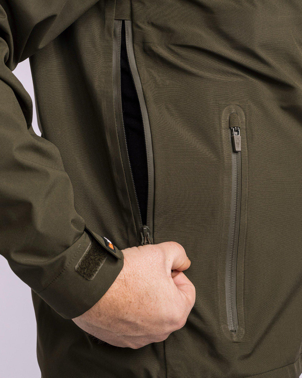 - Dubbele borstzakken, twee steekzakken, allemaal met ritssluiting.