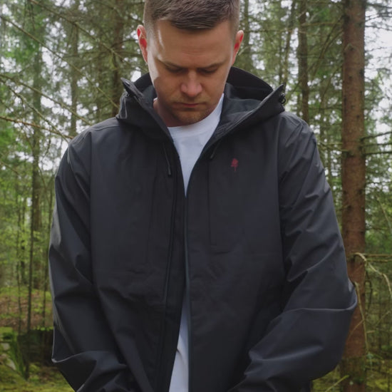 Een lichtgewicht, wind- en waterdichte hardshelljas met een capuchon en getapete naden.